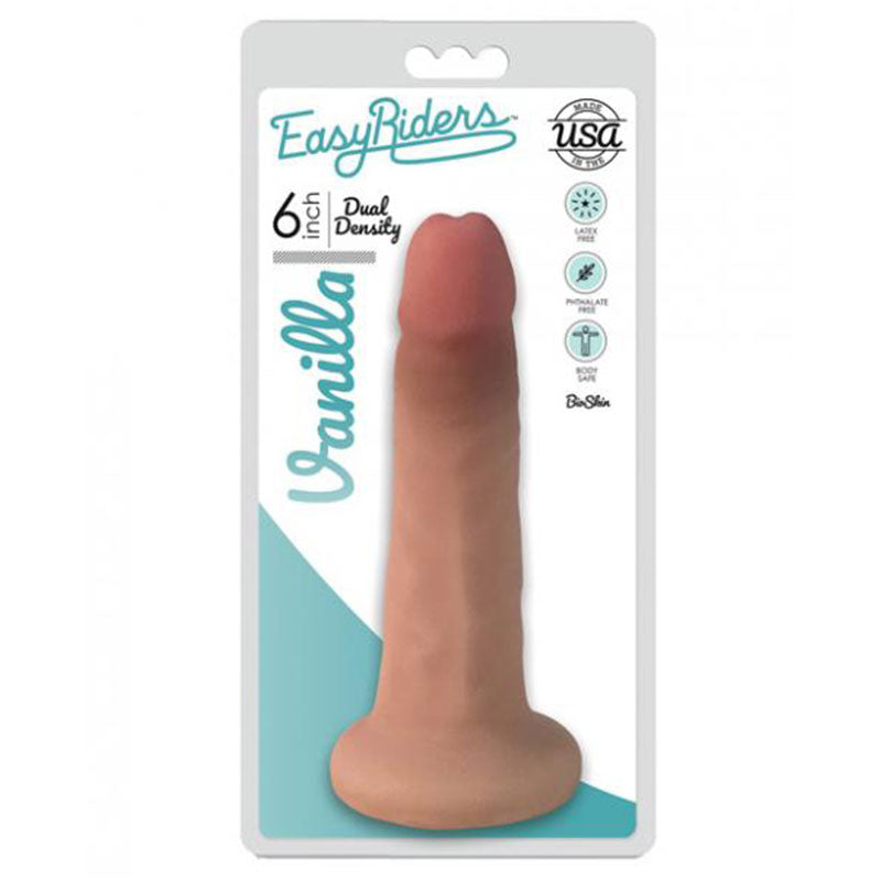 Ultra premium realistic dual density dong with 6in Vanilla and Strong Harness compatible suction cup base is crafted from lifelike BioSkin TPE material. Firm inner core with super soft outer skin.Handmade and hand finished with incredible detail. Made in the USA of lifelike Bioskin.It measures 6 inch length 5.25 inch insertable 1.5 inch width.Crank up your pleasure tonight with Easy Riders BioSkin Dual Density Dong with Suction Base by Curve Novelties. Designed for frisky beginners this sexy toy features firm yet flexible BioSkin material that feels so real PLUS lifelike details to fill your favorite hole. A plump phallic tip parts you easily and a thick detailed shaft with veins fills you up. Suck or ride on this juicy treat and enjoy for sexual pleasure like never before! A sturdy suction cup base prevents Easy Riders Dual Density Dong from traveling too far during vaginal or anal lovemaking and slips into your harness of choice for couple-friendly sessions that takes your breath away. And the suction cup base sticks to most flat hard surfaces for creative hands-free straddling when you`re on your own or if you want to put on a show! Easy Riders BioSkin Cock is made from latex-free phthalate-free body-safe dual density TPE for your peace of mind. Lubricate well with your favorite water-based lube and clean up in a snap before and after use with antibacterial soap and a warm water rinse (air-dry completely prior to storage). Curve Novelties sextoy novelty measures a cozy 6 inch long (15 cm) 5.25 inch insertable 1.5 inch diameter (4 cm) and is USA made