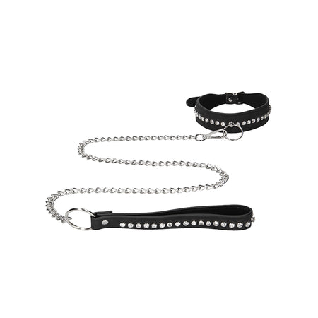 Ouch! Diamond Studded Faux Leather Collar With Leash Black