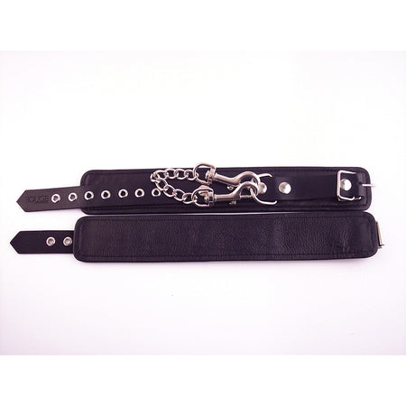 An exquisite pair of leather ankle cuffs. Fully adjustable buckle straps. Comes with a detachable double trigger hook chain connecting to a D-Ring. With black strap.